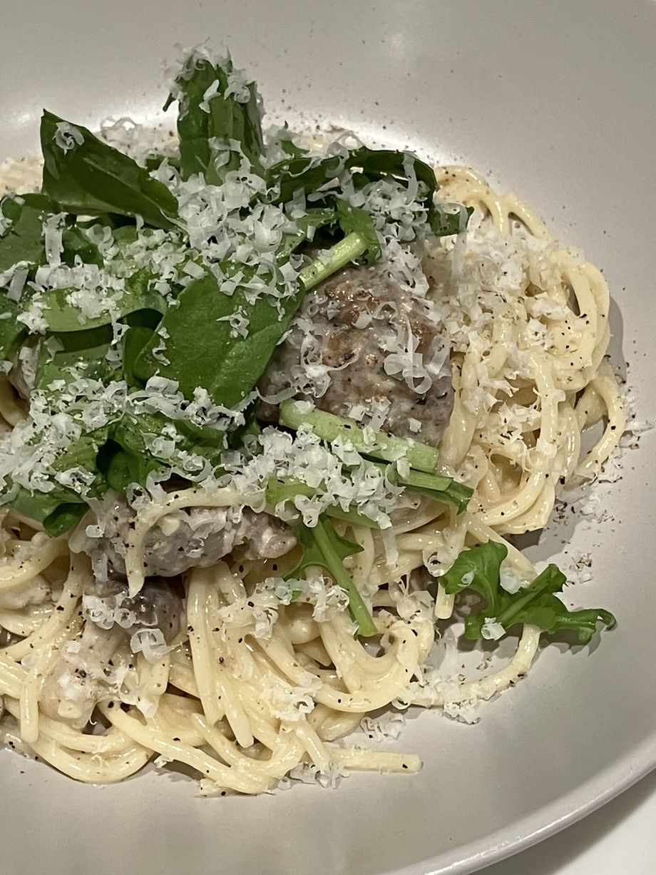本日、28(水)の日替りランチパスタは、自家製サルシッチャとルッコラのレモンクリームパスタです😁