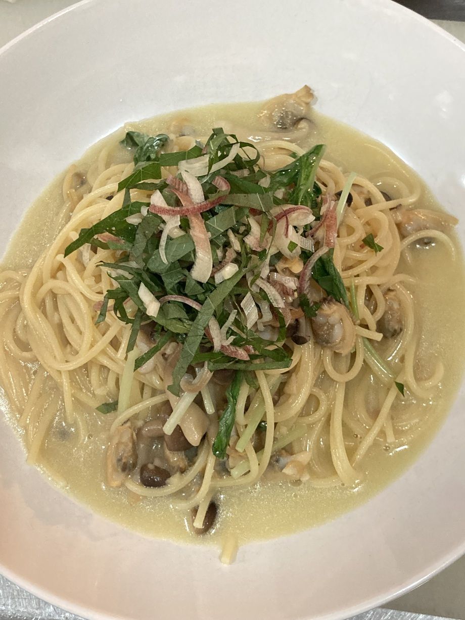 本日4日(水)の日替りランチパスタは、あさりと大葉・ミョウガの和風パスタです。